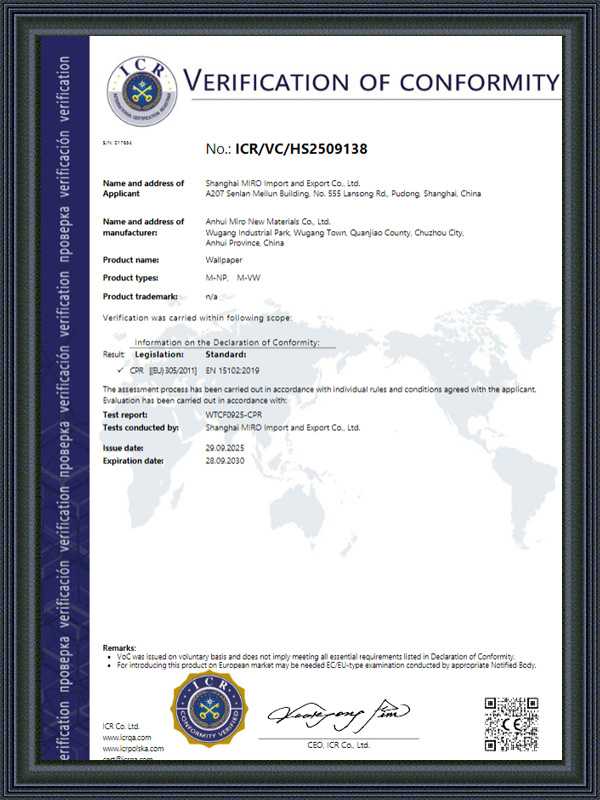 Основанная в 2001 году, Shanghai MIRO Import and Export Co., Ltd. является комплексным предприятием, специализирующимся на НИОКР, производстве и продаже строительных отделочных материалов, таких как материалы для защиты окружающей среды, обои, настенные покрытия и холсты. Штаб-квартира по продажам находится в новом районе Пудун, Шанхай, а завод расположен в городе Чучжоу, провинция Аньхой. Завод в Аньхое занимает площадь более 15 000 квадратных метров, с 10 000 квадратных метров завода и офиса, и в настоящее время имеет 50 сотрудников, 3 передовые линии по производству покрытий, 2 машины для нанесения клеевого покрытия и несколько машин для тиснения, полировки и резки. Ежемесячная производственная мощность может достигать 1,2 миллиона метров, с набором научной системы управления качеством и полной системой послепродажного обслуживания, которые соответствуют стандартам ISO9001 и ISO14001, и продукция хорошо продается в Китае, Европе и Соединенных Штатах.